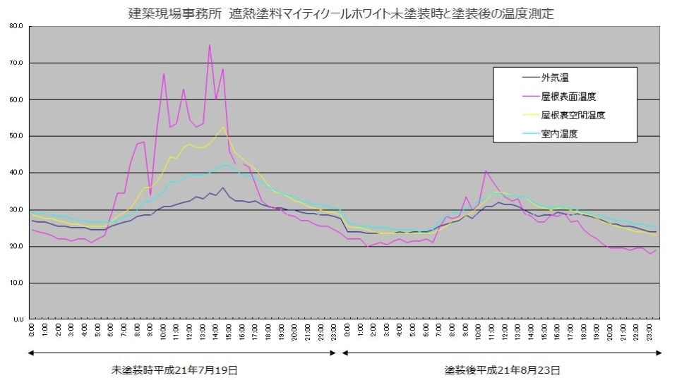 リボールマイティクールホワイト施工後、屋根裏空間温度と室温がかなり下り外気温に近い値になりました。リボールマイティクールホワイトを施工することで屋根からの熱エネルギーの侵入を防いでいるのがわかります。
